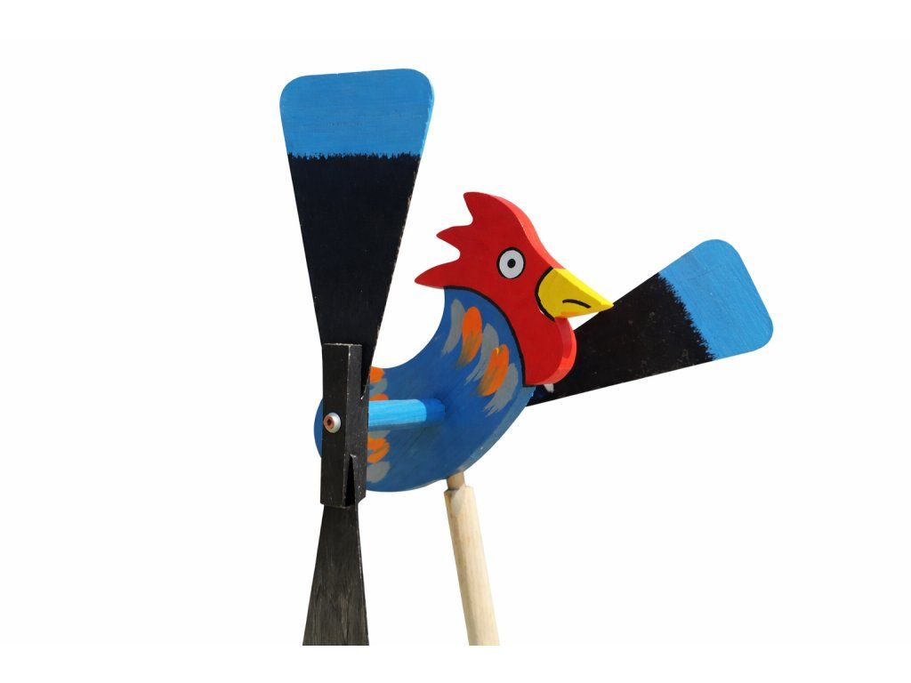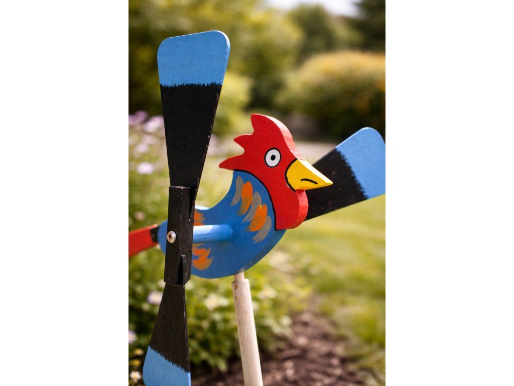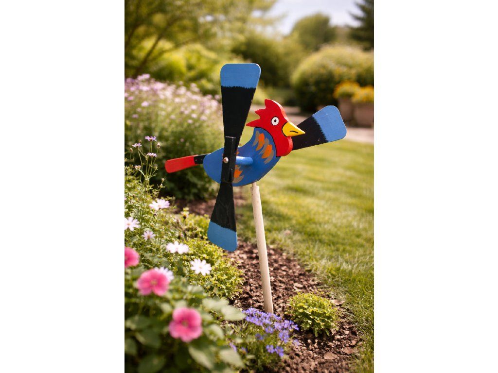 Dřevěná vrtulka ve tvaru kohouta je ideálním doplňkem do každé zahrady, dvora či na venkovskou chalupu. Tento ručně vyrobený produkt spojuje tradiční slovenské řemeslo s funkčním designem, který rozzáří každý exteriér. Veselý motiv kohouta v kombinaci s pohyblivými křídly vytváří dojem života a pohybu, který neunikne žádnému oku.