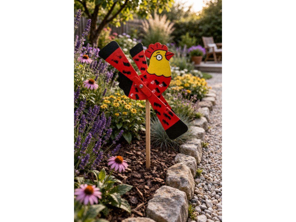 Slepice je symbol domova, tepla a klidu – a v podobě této vrtulky přinese pohodu i do vašeho prostředí. Když zafouká vítr, křídla se roztočí a přinesou do zahrady pohyb a život.