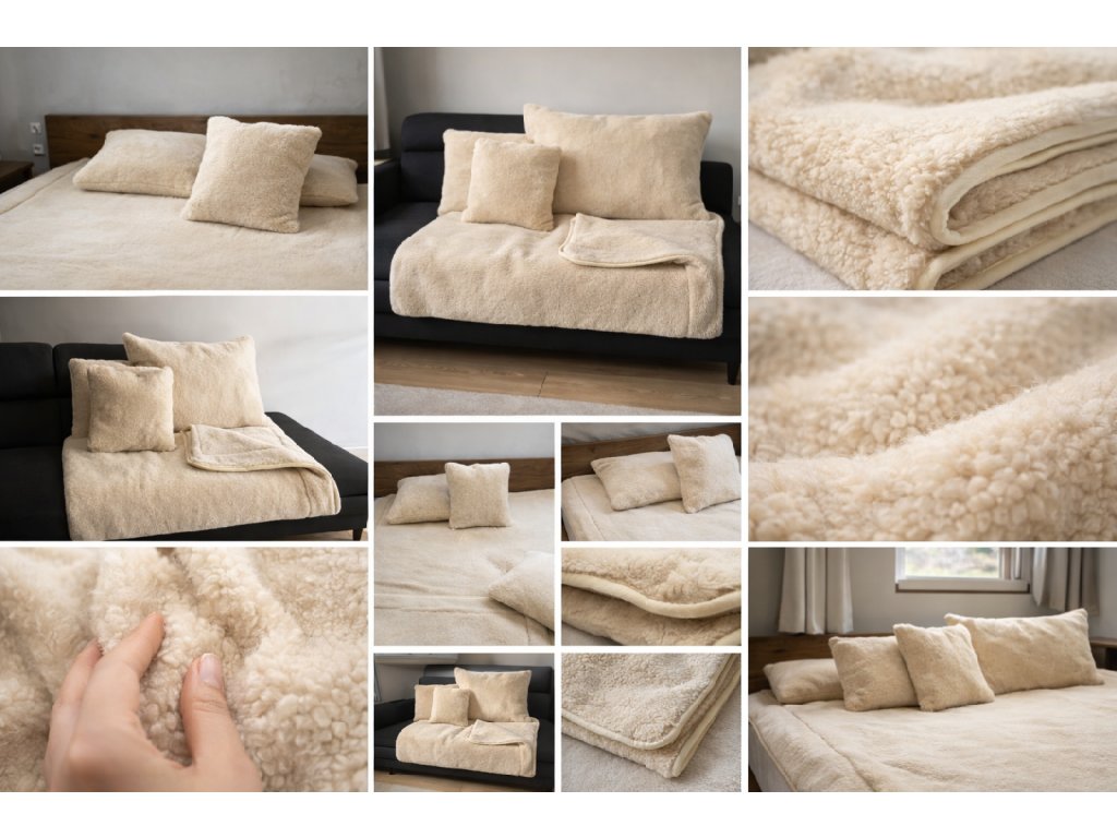 Rozměry: Deka z ovčí vlny 200x140cm, velký polštář 70x50cm, malý polštář 40x40cm